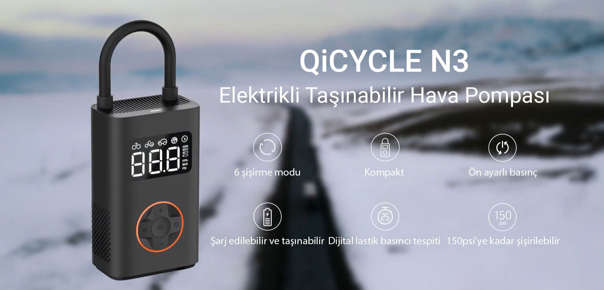 Qicycle N3 150PSI Elektrikli Taşınabilir Hava Pompası Araç Lastik Şişirme Kompresörü